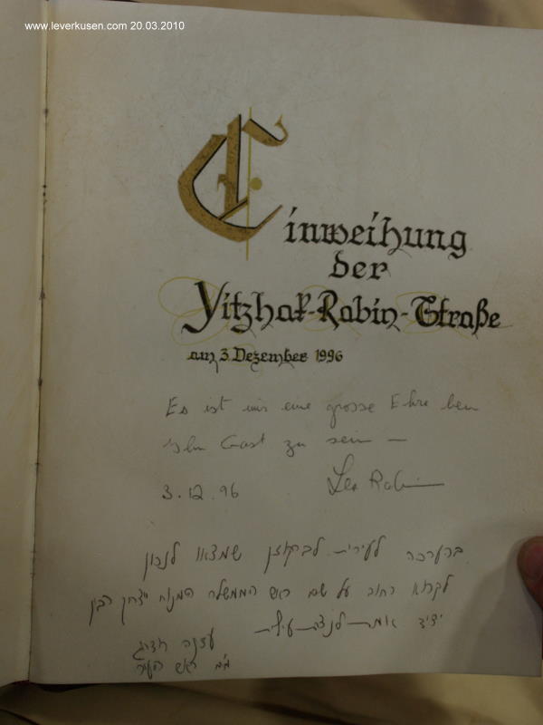 Einweihung der Yitzhak-Rabin-Straße am 3. Dezember 1996 Es ist uns eine grosse Ehre bei Ihnen Gast zu sein. 3.12.96 Lea Rabin