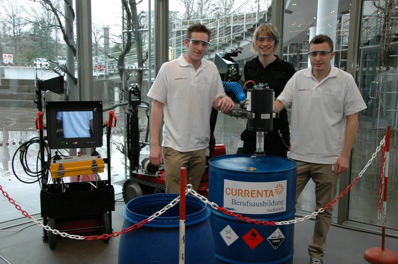 Mario Retzlaff (links), Carsten Born (Mitte) und Marcel Gromotka (rechts) mit ihrem Druckentlastungswerkzeug 2.0 Aufgenommen im BayKomm