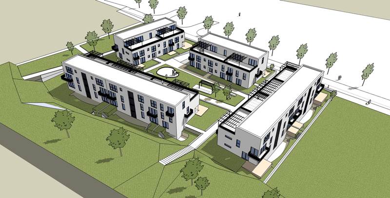 Skizze von Architekt Theodor Schaller, die eine Idee davon vermitteln, wie das Mehrgenerationen-Wohnprojekt aussehen könnte. Die endgültige Gestaltung und Details werden mit den zukünftigen Nutzern erarbeitet.