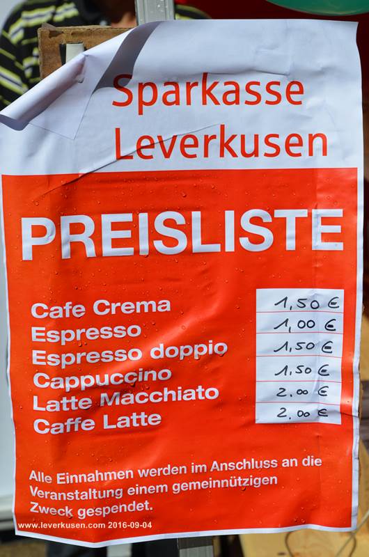 Cafe Crema, Espresso, Espresso doppio, Cappucino, Latte Machiato, Caffee Latte Alle Einnahmen werden im Anschluss an die Veranstaltung einem gemeinnützingen Zweck gespendet.
