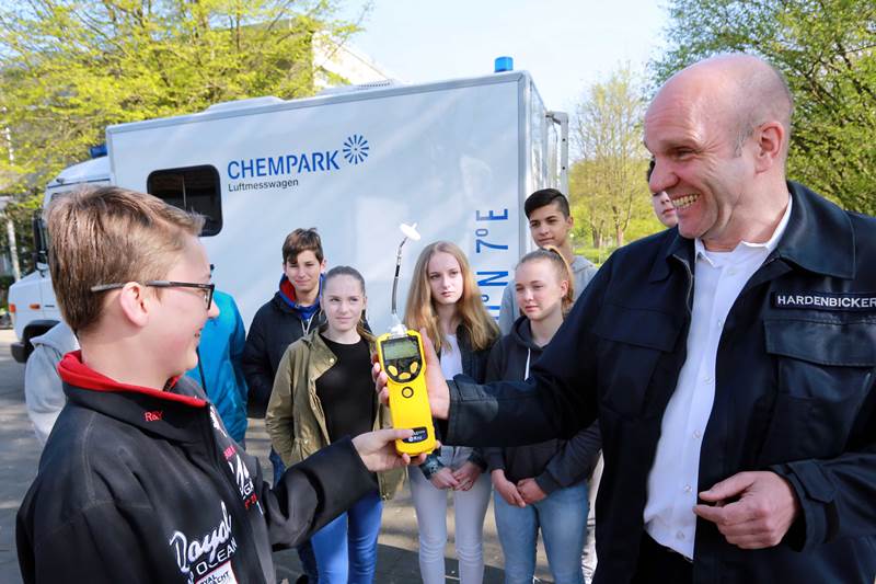 Spaß beim Erklären: Jürgen Hardenbicker mit Handmessgerät und einer Schülergruppe vor dem Luftmesswagen aus dem Chempark Leverkusen. Foto Currenta