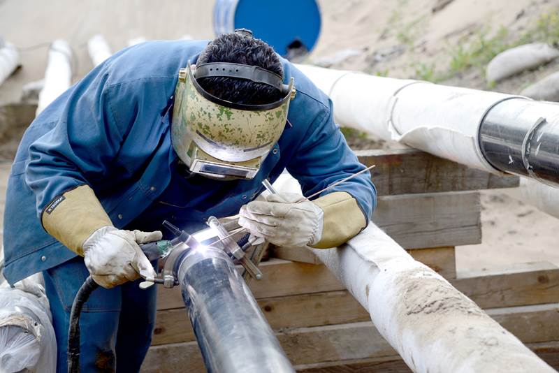 Nach rund eineinhalb Jahren Bauzeit ist die neue Rheinunterquerung zwischen Leverkusen und Köln-Merkenich jetzt betriebsbereit. Das Foto zeigt Schweißarbeiten für die Verbindung der alten mit der neuen Leitung.