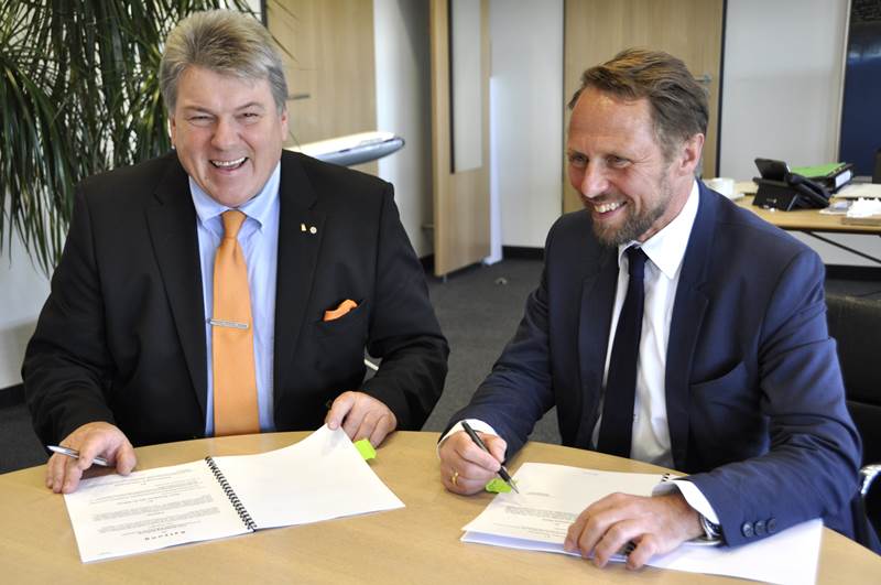 Michael Kreuzberg, Landrat des Rhein-Erft-Kreises und Geschäftsführer des HBZ unterschreibt mit Oberbürgermeister Uwe Richrath den „Vertrag zur Interkulturellen Begabtenförderung“