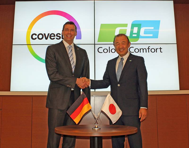 Kaoru Ino, Director, President und CEO der DIC Corporation (r.) und Dr. Markus Steilemann, Vorstandsvorsitzender von Covestro besiegeln einen weiteren Meilenstein in einer über 18-jährigen erfolgreichen Partnerschaft.