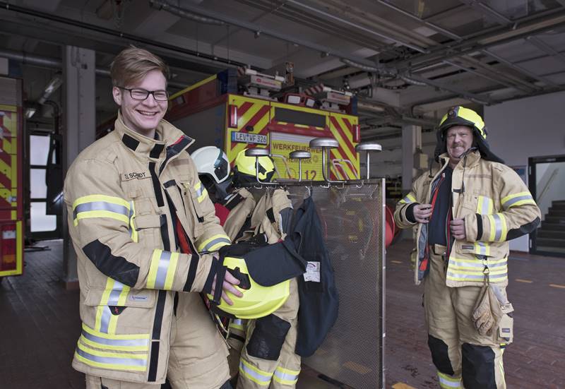Neues Design macht gute Laune: Das Team der Werkfeuerwehr freut sich über die neuen Kleidungsstücke für den Einsatz. Foto: Currenta